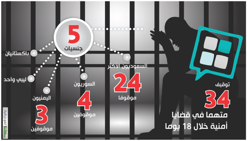 أوقفت الجهات الأمنية المختصة 34 متهما من خمس جنسيات مختلفة على صلة بأعمال مشبوهة تمس الأمن الوطني، وتم إيقافهم منذ بداية شهر رمضان المبارك تمهيدا لإحالتهم إلى النيابة العامة؛ لاستكمال الإجراءات النظامية بحقهم.