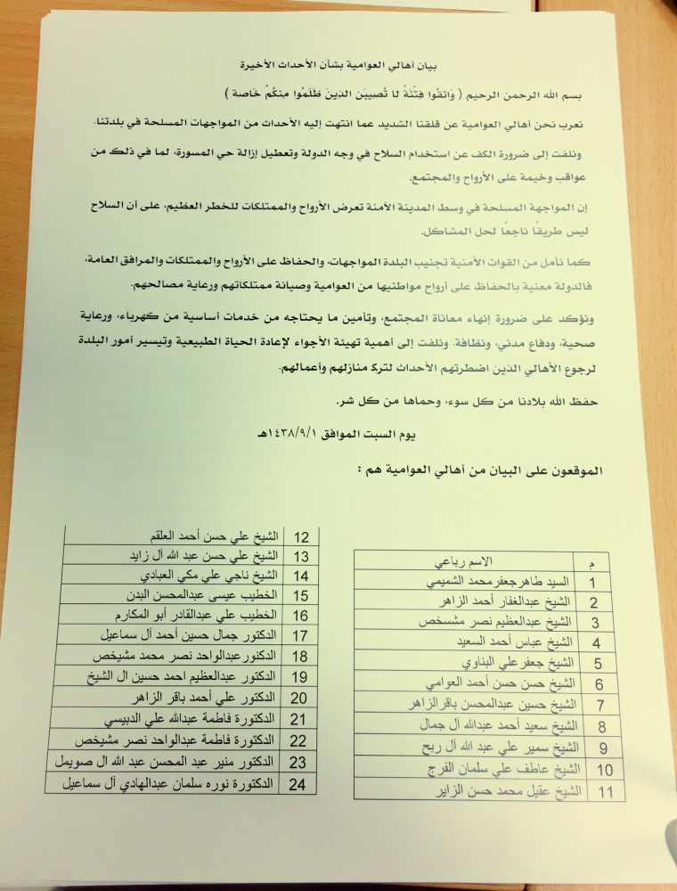 وذكروا في بيانهم، أن الدولة معنية بالحفاظ على أرواح المواطنين في العوامية وصيانة الممتلكات ورعاية المصالحة، متمنين تجنيب البلدة المواجهات والحفاظ على الأرواح والممتلكات والمرافق العامة. وابتهل الأهالي إلى الله أن يحفظ الوطن من كل سوء وحمايتها من كل شر.