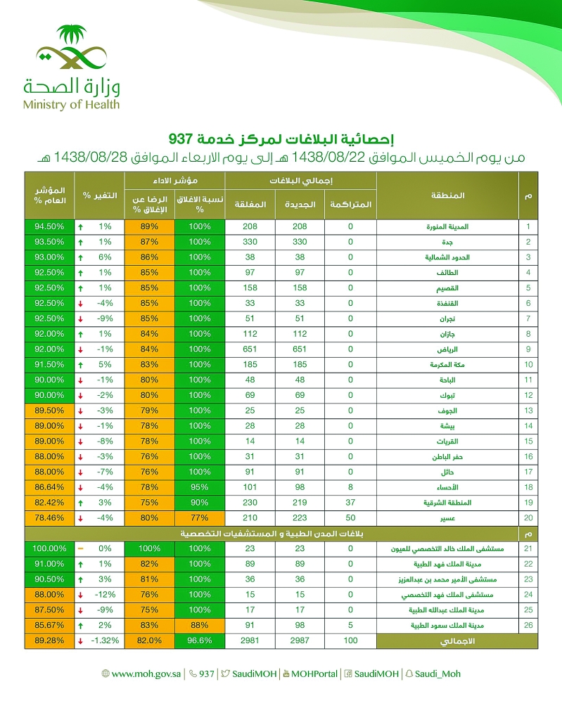 ويشير المتحدث لـ«عكاظ» إلى أنه في ما يتعلق بالبلاغات، فإن وزارة الصحة في غاية الشفافية بنشرها أعداد بلاغات (٩٣٧) أسبوعياً لكل منطقة على حدة، والبلاغات المنتهية بحل ونسبة رضاء المبلغين.