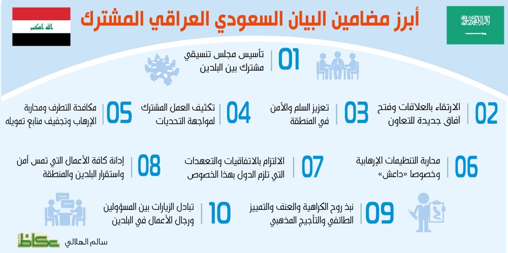 كما اتفق البلدان في بيان مشترك صدر أمس في ختام الزيارة الرسمية لرئيس مجلس الوزراء العراقي حيدر العبادي للمملكة حيث التقى خادم الحرمين الشريفين الملك سلمان بن عبدالعزيز، وولي ولي العهد النائب الثاني لرئيس مجلس الوزراء وزير الدفاع الأمير محمد بن سلمان بن عبدالعزيز، على تكثيف العمل المشترك لمواجهة التحديات السياسية والأمنية التي تواجه الأمتين العربية والإسلامية، وفي مقدمتها مكافحة التطرف ومحاربة الإرهاب بكافة أشكاله وصوره، وأكد الجانبان أهمية تجفيف منابع الإرهاب وتمويله، والالتزام بالاتفاقيات والتعهدات التي تلزم الدول بهذا الخصوص.