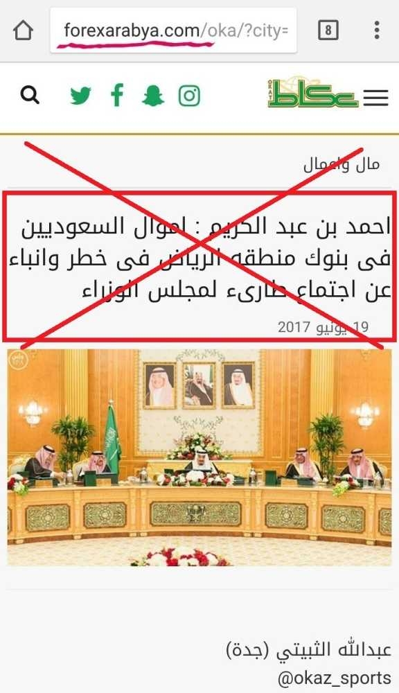 وهذه الروابط الالكترونية لا علاقة لها بموقع صحيفة "عكاظ" الالكتروني (www.okaz.com.sa ) ، وبإمكان القارئ التمييز السريع من خلال عنوان الموقع الذي تظهر فيه الروابط: (forexarabya.com) وهو موقع مسجل في الولايات المتحدة الأمريكية من قبل جهة غير معلومة، وتسعى الصحيفة لاتخاذ الاجراءات القانونية اللازمة لوقف هذه الانتهاكات التي تهدف إلى استغلال اسم الصحيفة وانتشارها الواسع لتمرير الأخبار الكاذبة، تحقيقا لأهداف مشبوهة.
