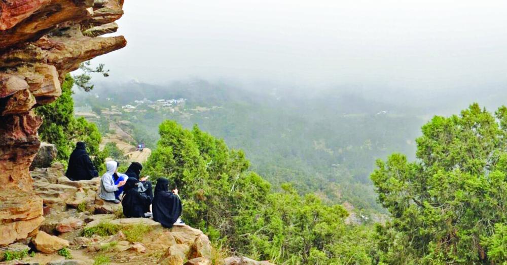سائحات في إحدى جبال عسير. (عكاظ)
