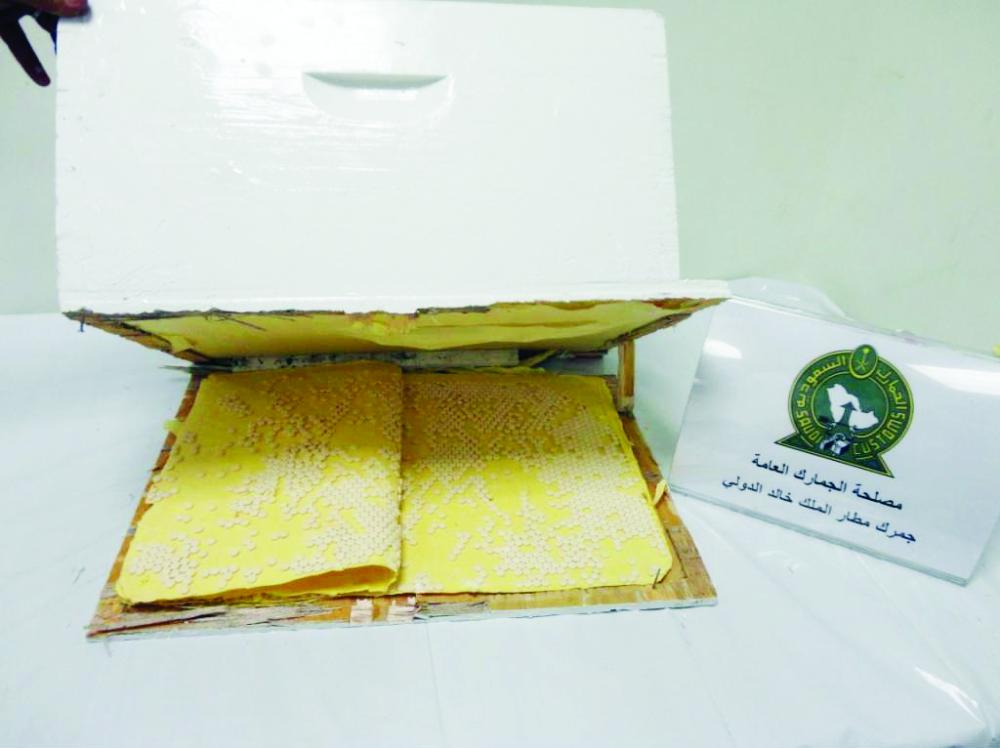 وأوضح مدير عام جمرك مطار الملك خالد الدولي محمد العقيّل، أنه وردت للجمرك إرسالية عبارة عن أربعة صناديق خشبية تحتوي على كمية من «العسل» وبتفتيشها عُثر على (12.108) حبات، كانت مخفية في مخبأ تم تجهيزه لغرض التهريب في أسفل الصناديق، كما عُثر على كمية أخرى من حبوب الكبتاجون بلغت (7.710) حبات، كانت مُخبأة في إرسالية وردت للجمرك عبارة «لوحة خشبية» وذلك بإخفائها في تجويف بداخل اللوحة.