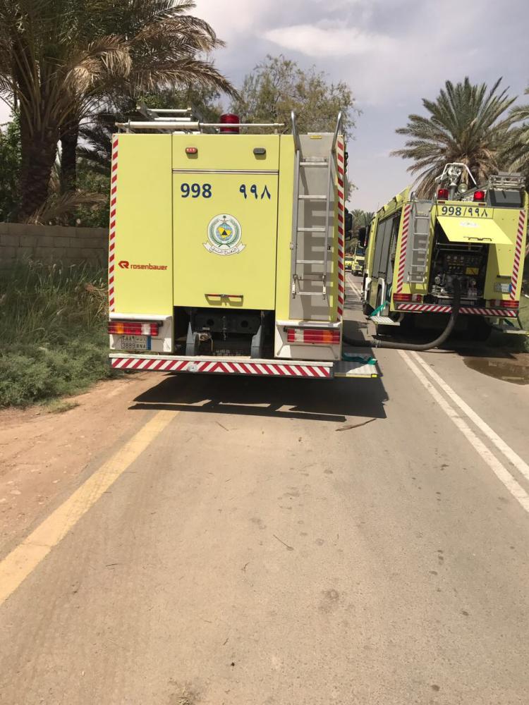 وعلى الفور نجحت الفرق بإخماد النيران، ومنع امتدادها للنخيل والمزارع المجاورة .
