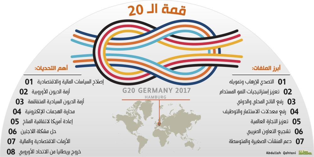 أكد خبراء اقتصاديون لـ«عكاظ» أن قمة مجموعة دول العشرين القادمة في ألمانيا ستطرح قضايا الإرهاب، والهجرة كملفات سياسية ملحة في ضوء ما تتعرض له البلدان العربية والأوروبية من عمليات إرهابية.