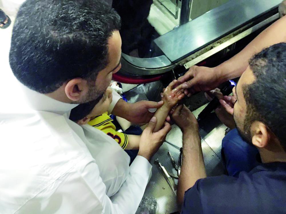 من جهة أخرى، أكد العقيد الجهني أن فرق الإنقاذ باشرت احتجاز يد طفل داخل سير سلم كهربائي في أحد المراكز التجارية بالمنطقة المركزية بالمدينة، وقد تم فك الاحتجاز ونقل الطفل إلى المستشفى وهو بصحة جيدة.