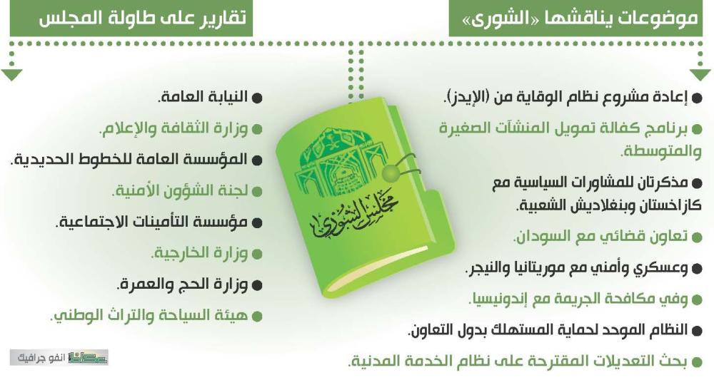 يناقش مجلس الشورى في جلسة الثلاثاء القادم تقرير لجنة الشؤون الصحية بشأن إعادة مشروع نظام الوقاية من متلازمة العوز المناعي المكتسب (الإيدز) وحقوق المصابين وواجباتهم عملاً بالمادة 17 من نظام المجلس، وتقريري لجنة الشؤون الخارجية بشأن مشروع مذكرة تفاهم في المشاورات السياسية بين وزارة الخارجية بالمملكة ووزارة خارجية جمهورية كازاخستان، ومشروع مذكرة تفاهم بشأن المشاورات السياسية بين وزارة خارجية المملكة ووزارة خارجية جمهورية بنغلاديش الشعبية، وتقرير لجنة الشؤون الإسلامية والقضائية بشأن مشروع مذكرة تفاهم في مجال الشؤون الإسلامية بين وزارة الشؤون الإسلامية والدعوة والإرشاد في المملكة ووزارة الشؤون الدينية في جمهورية إندونيسيا، ومشروع مذكرة تفاهم بين ديوان المظالم في المملكة وديوان المظالم العامة والحسبة في جمهورية السودان في مجال القضاء الإداري، ويصوت على وجهة نظر لجنة حقوق الإنسان والجهات الرقابية بشأن ملاحظات الأعضاء وآرائهم تجاه التقرير السنوي للنيابة العامة، ويناقش تقرير لجنة الثقافة والإعلام والسياحة والآثار بشأن التقرير السنوي لوزارة الثقافة والإعلام، وتقرير لجنة النقل والاتصالات وتقنية المعلومات بشأن التقرير السنوي للمؤسسة العامة للخطوط الحديدية، ويصوت على وجهة نظر لجنة الاقتصاد والطاقة بشأن ملاحظات الأعضاء وآرائهم تجاه مشروع النظام (القانون) الموحد لحماية المستهلك بدول مجلس التعاون لدول الخليج العربية كنظام إلزامي.