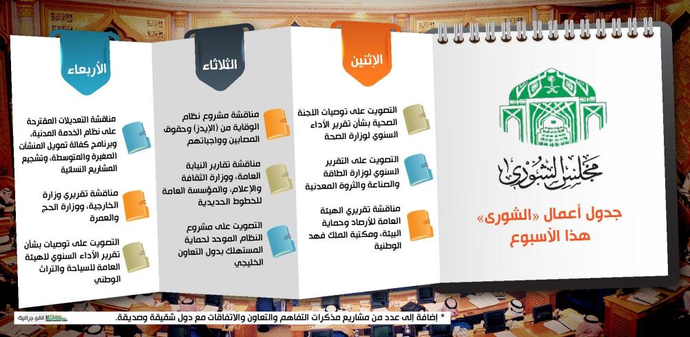 ويناقش المجلس في الجلسة ذاتها تقرير لجنة الثقافة والإعلام والسياحة والآثار بشأن التقرير السنوي لوزارة الثقافة والإعلام للعام المالي 1435/1436 وتقرير لجنة النقل والاتصالات وتقنية المعلومات بشأن التقرير السنوي للمؤسسة العامة للخطوط الحديدية للعام المالي 1436/1437، فيما يصوت على مشروع النظام الموحد لحماية المستهلك بدول مجلس التعاون لدول الخليج العربية وذلك بعد أن يستمع إلى وجهة نظر لجنة الاقتصاد والطاقة بشأن ملاحظات الأعضاء وآرائهم التي أبدوها أثناء مناقشة مشروع النظام في جلسة سابقة.