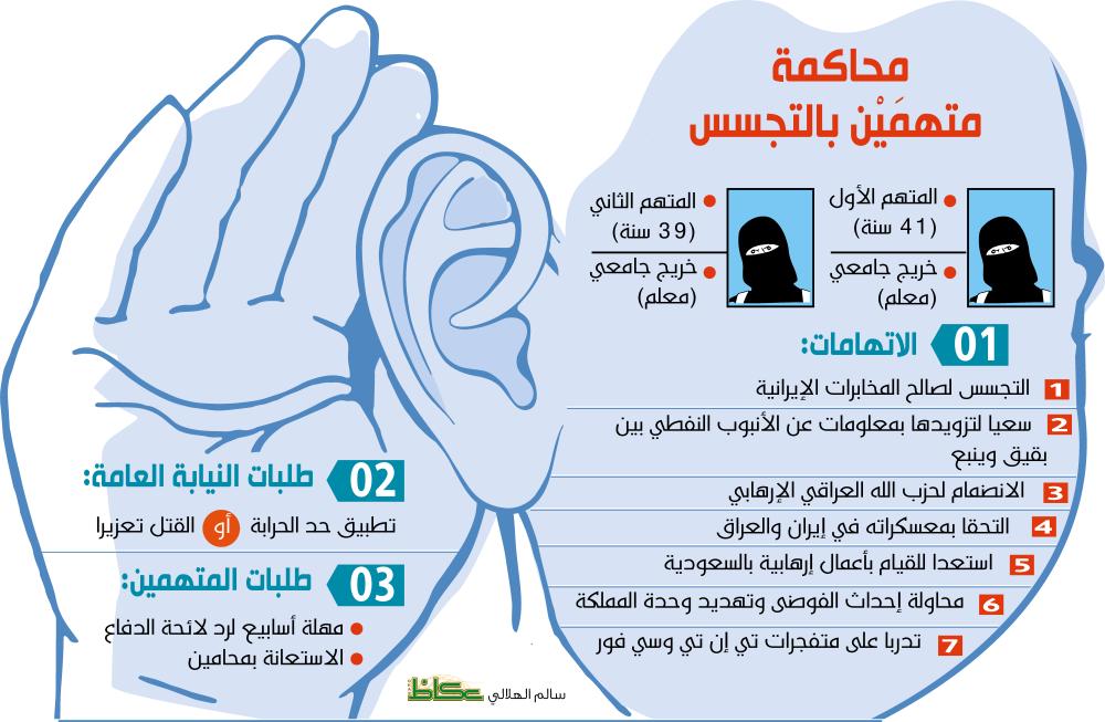 تقدمت النيابة العامة بلائحة اتهامات ضد مواطنين اثنين، تشمل التجسس داخل السعودية لصالح المخابرات الإيرانية، وسعيهما لتنفيذ أعمال إرهابية بقصد إحداث الفوضى وزعزعة الأمن الداخلي وتفكيك وحدتها، وإهدار مقدراتها ومكتسباتها تنفيذا لتوجيهات خارجية بعد تلقيهما تدريبات بمعسكرات الحرس الثوري الإيراني وحزب الله العراقي في طهران.