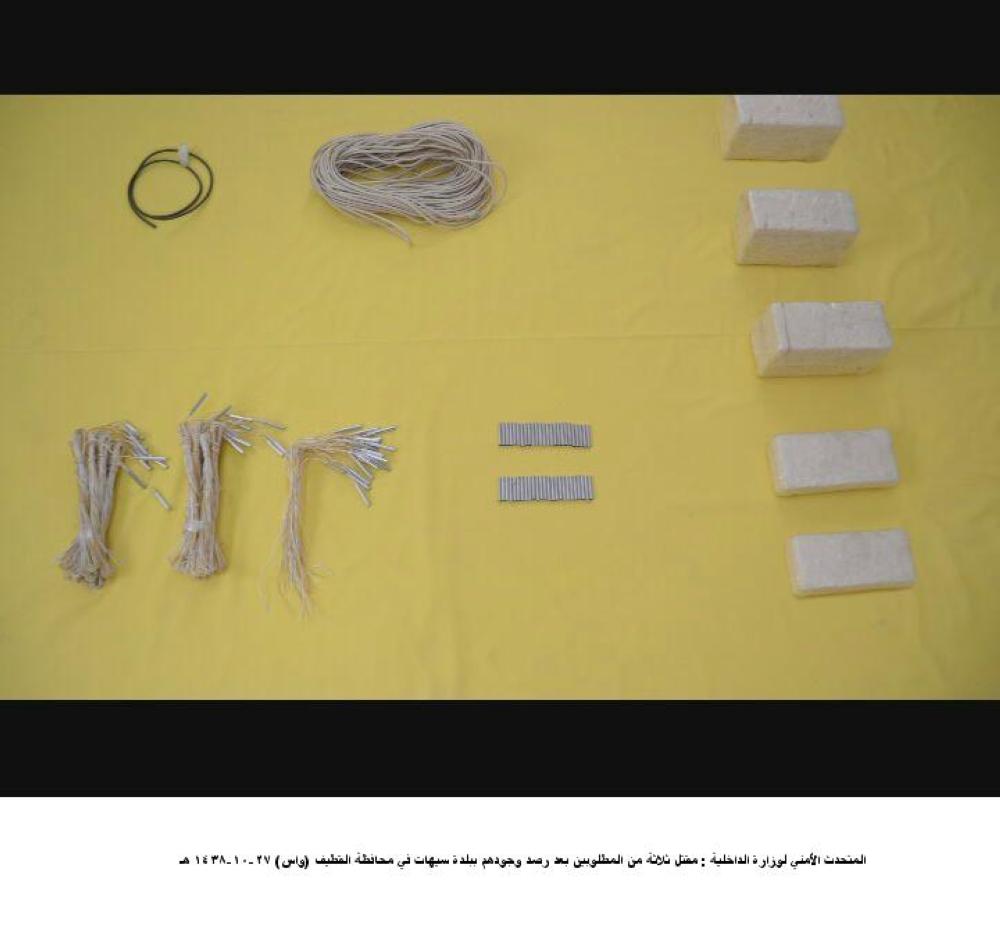 وأشار إلى أنه عند محاصرة المطلوبين الثلاثة من قبل رجال الأمن ودعوتهم لتسليم أنفسهم بادر المذكورون بإطلاق النار بشكل عشوائي وكثيف، واقتضى الموقف الرد عليهم لتحييد خطرهم مما نتج عنه مقتلهم جميعا، فيما لم يتعرض أحد من المارة أو رجال الأمن لأي أذى ولله الحمد، كما أسفرت العملية الأمنية بفضل الله عن ضبط كمية كبيرة من المواد المتفجرة داخل سيارتهم تجاوز وزنها «عشرة كيلو جرامات»، مع صواعق متفجرة ذات اشتعال حراري وكهربائي، وثلاثة أسلحة رشاش، ومسدس وذخائر حية.
