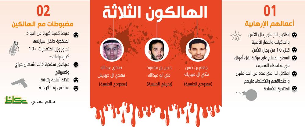 وذكر المتحدث أن الهالكين الثلاثة متورطون في العديد من الجرائم الإرهابية والجنائية ومنها: إطلاق النار على رجال الأمن والمركبات والمقار الأمنية، مما نتج عنه مقتل عدد من رجال الأمن ـ رحمهم الله ـ وهم: الجندي أول / رائد عبيد عابد المطيري بتاريخ 28 / 2 / 1436هـ.