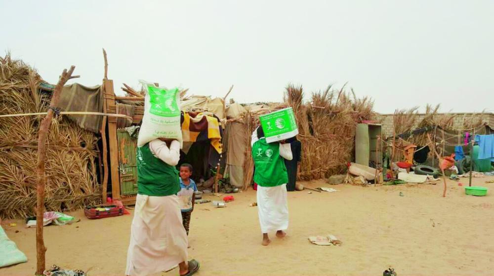 عاملان في المركز أثناء توزيع السلال الغذائية على النازحين اليمنيين أمس. (واس)