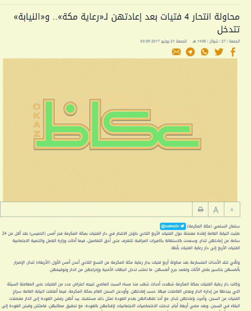 وكانت «عكاظ» نشرت خبرا بعنوان (محاولة انتحار 4 فتيات بعد إعادتهن لـ«رعاية مكة».. و«النيابة» تتدخل)، في عددها الصادر يوم الجمعة 27/شوال/1438 الموافق 21 يوليو 2017، حول محاولة الفتيات الانتحار. وشهدت دار رعاية الفتيات بمكة المكرمة أحداث شغب منذ السبت الماضي، نتيجة اعتراض عدد من الفتيات على المعاملة السيئة التي يجدنها من إدارة الدار وبعض العاملات فيها، حسب إفادتهن. وأودعن السجن العام بمكة المكرمة، فيما أطلقت النيابة العامة سراح الفتيات من السجن، وأمرت بإعادتهن للدار، مع أخذ تعهداتهن بعدم العودة لمثل ذلك مستقبلا، بيد أنهن رفضن العودة إلى الدار مفضلات البقاء في السجن، وبعد مضي أربعة أيام، تدخلت الاختصاصيات الاجتماعيات لإقناعهن بالعودة، مع تحقيق مطالبهن، فامتثلن وقبلن العودة إلى الدار، إلا أن أربعا منهن حاولن الانتحار، قبل أن يوقفن وينقلن إلى دار رعاية فتيات أبها.