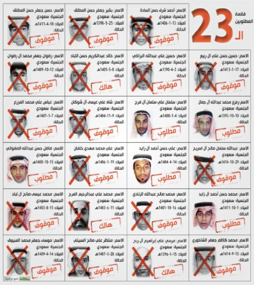 وتقلصت قائمة الـ9 مطلوبين التي كانت تضم كلا من المطلوبين: محمد حسين علي العمار، فاضل عبدالله محمد آل حمادة، علي بلال سعود آل حمد، جعفر بن حسن مكي المبيريك، ميثم بن علي محمد القديحي، مفيد حمزة بن علي العلوان، ماجد بن علي عبدالرحيم الفرج، حسن محمود علي أبو عبدالله، أيمن إبراهيم حسن المختار إلى 6 مطلوبين وهم: محمد حسين علي العمار، علي بلال سعود آل حمد، ميثم بن علي محمد القديحي، مفيد حمزة بن علي العلوان، ماجد بن علي عبدالرحيم الفرج، أيمن إبراهيم حسن المختار، وذلك بعد مقتل ثلاثة فاضل آل حمادة، جعفر المبيريك، حسن أبو عبدالله، والقبض على بقية المطلوبين في القائمة.