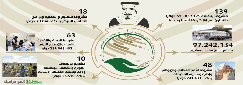 من جهة ثانية، قدم مركز الملك سلمان للإغاثة والأعمال الإنسانية للأشقاء في اليمن، منذ أن دشنه خادم الحرمين الشريفين الملك سلمان بن عبدالعزيز وحتى الآن، مشاريع بلغت 139 مشروعا متنوعا للمحافظات اليمنية كافة، في مجالات عدة، شملت المساعدات الإغاثية، والإنسانية، والإيوائية، وبرامج الإصحاح البيئي، ودعم برامج الزراعة، والمياه، بطرق احترافية، بالتعاون مع 84 شريكا أمميا ومحليا، وتم التركيز على مشاريع الطفل والمرأة ودعم اللاجئين اليمنيين في جيبوتي والصومال بمبلغ قدره 615.839.175 دولارا أمريكيا.