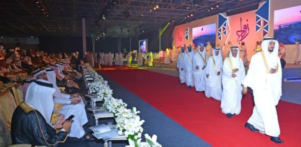 وأقيم حفل خطابي بهذه المناسبة بدئ بتلاوة آيات القرآن الكريم، ثم مسيرة زفت للعرسان المحتفى بهم تلاه نشيد ترحيبي بسموه والحضور.