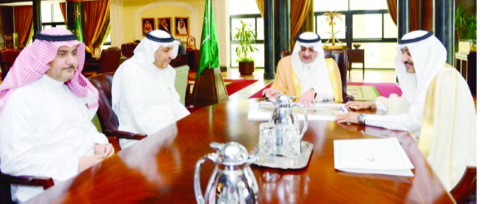 أمير تبوك أثناء مناقشته المشاريع مع مدير الطرق. (عكاظ)