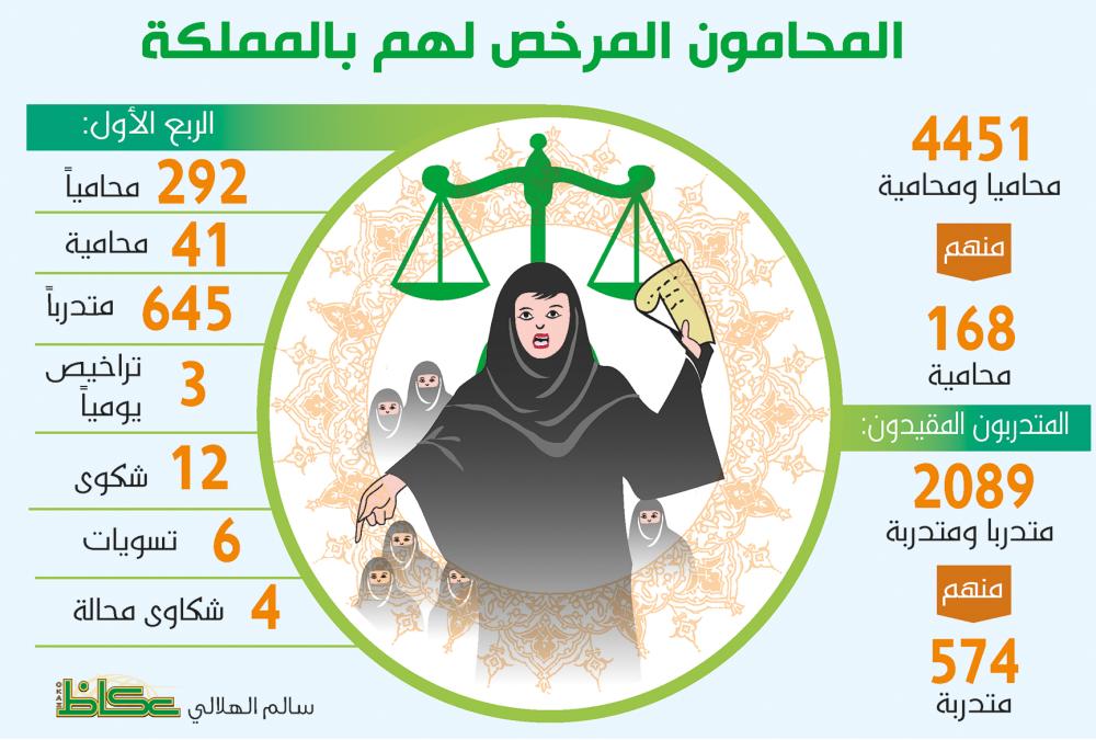 كشف تقرير الهيئة السعودية للمحامين، لأعمالها في الربع الثاني للعام المالي 2017، وصول عدد المحامين المرخصين إلى 4451 محاميا ومحامية، منهم 168 محامية، بنسبة 3.77%، في حين بلغ المتدربون المقيدون 2089 متدربا ومتدربة، منهم 574 متدربة، بما نسبته 26%.