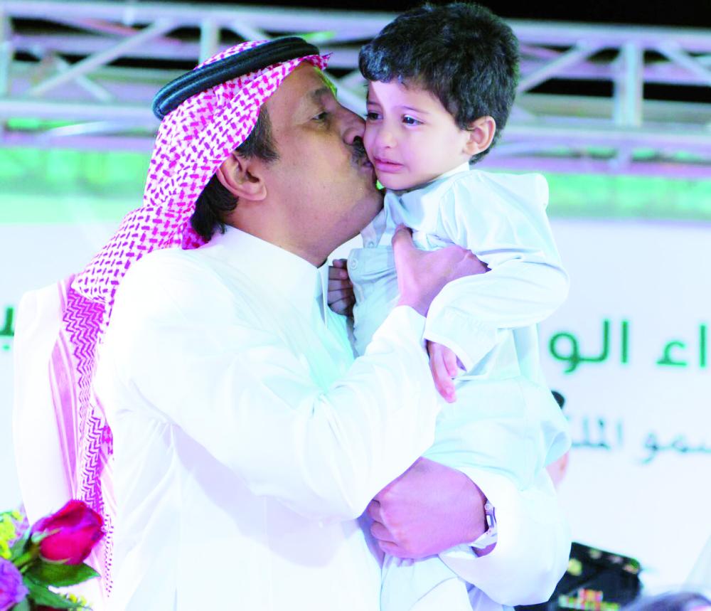 أمير الباحة يطبع قبلة على أحد أبناء شهداء الوطن. (عكاظ)