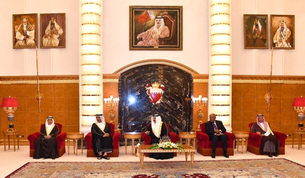 جاء ذلك لدى استقباله في قصر الصخير مساء أمس (السبت) وزير الخارجية السعودي عادل الجبير، ووزير خارجية الإمارات عبدالله بن زايد آل نهيان، ووزير الخارجية المصري سامح شكري، يرافقهم وزير خارجية البحرين خالد بن أحمد بن محمد آل خليفة، بمناسبة انعقاد الاجتماع المشترك لوزراء خارجية الدول الأربع في مملكة البحرين.