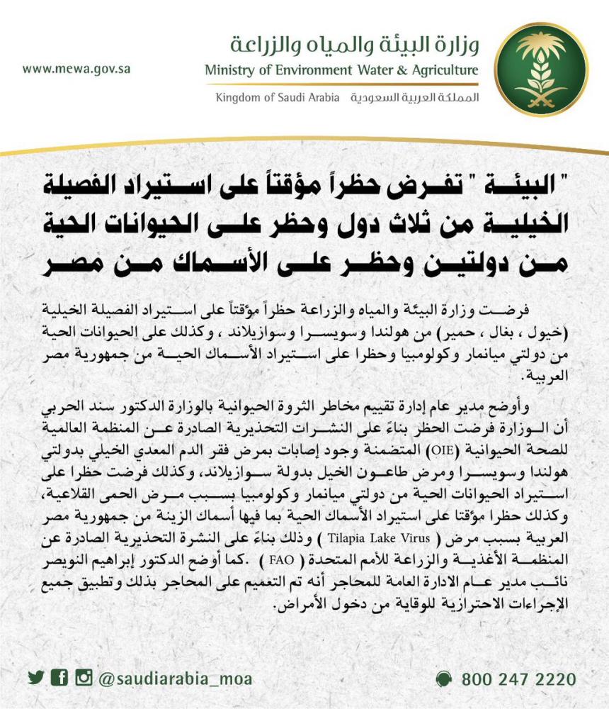 وأوضح مدير عام إدارة تقييم مخاطر الثروة الحيوانية بالوزارة الدكتور سند الحربي، أن الوزارة فرضت الحظر بناءً على النشرات التحذيرية الصادرة عن المنظمة العالمية للصحة الحيوانية (OIE)، المتضمنة وجود إصابات بمرض فقر الدم المعدي الخيلي بدولتي هولندا وسويسرا، ومرض طاعون الخيل بدولة سوازيلاند.