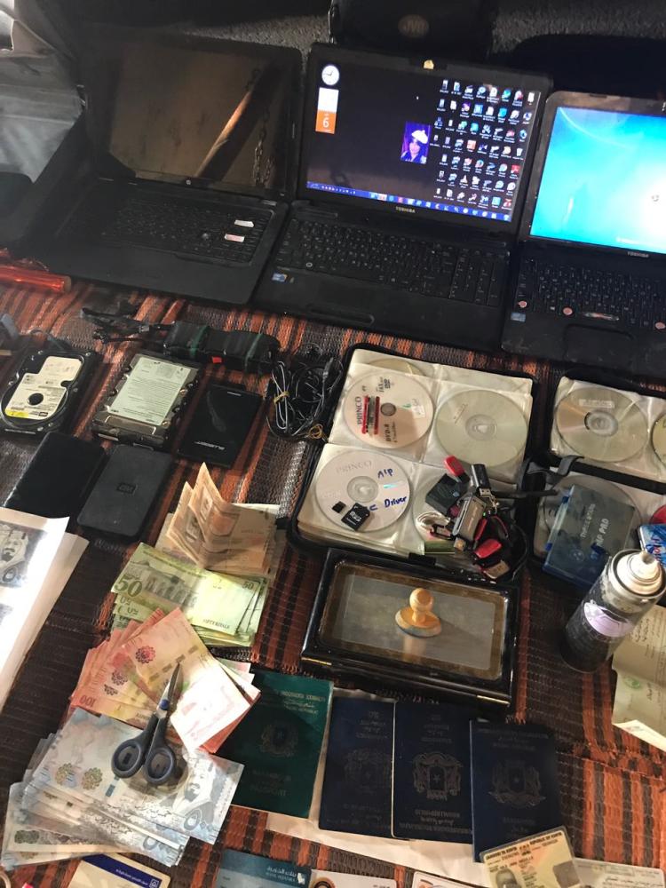 وقال الميمان: وعليه فقد تم العمل على تحليل المعلومات المتاحة وتتبعها من قبل قوة المهمات والواجبات الخاصة بشرطة المنطقة، ووضع المتهم تحت مجهر الرصد الأمني على مدار الساعة، ووفقاً لما تم اتخاذه من إجراءات، فقد أسفرت الجهود عن ضبطه والسيطرة عليه في كمين محكم، وعثر بحوزته على أوراق نقدية مزيفه من عدة فئات، كما ضبط بحوزته على مجموعة أوراق مزيفه جاهزة للقص والتصريف و22 إقامة مزيفة و27 كرت إقامة جاهز للتزييف، وثلاث بطاقات إقامة نازحين مزيفة وأربع جوازات سفر مزورة، إضافة لمعمل متكامل للتزييف والتزوير، وبسماع أقواله أقر بما نسب اليه.