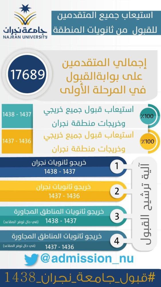 وأضاف أن المتقدمين على بوابة القبول الإلكترونية في المرحلة الأولى 18 ألف متقدم، إذ بلغت نسبة قبول الخريجين 100%، والأولوية كانت لخريجي ثانويات نجران للعام الدراسي 1436/1437، ثم للعام 1437/1438، وبعدها لخريجي ثانويات المناطق المجاورة للعامين المذكورين في حال توافر مقاعد.