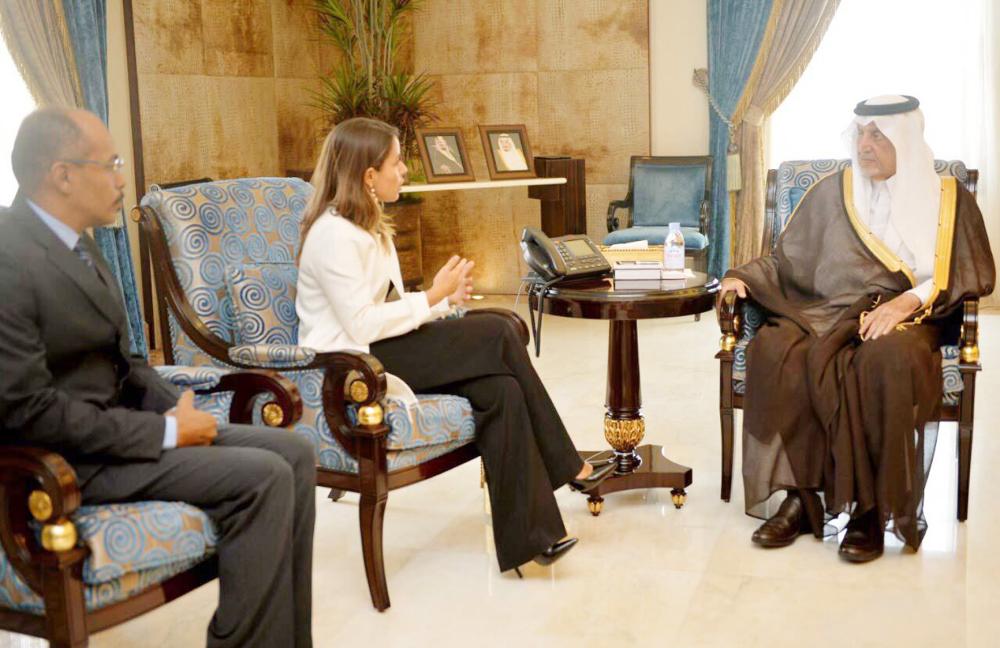 الأمير خالد الفيصل مستقبلاً القنصل الإيطالي اليزابيتا مارتيني أمس.