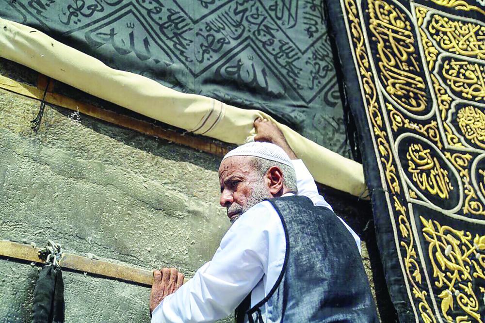 أحد العاملين يشارك في رفع الكسوة. (خاص عكاظ)