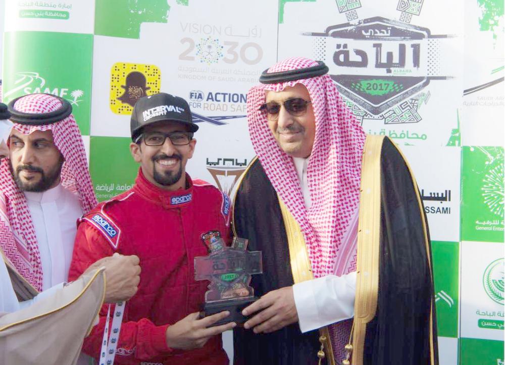 أمير الباحة متوجاً الفائز بالمركز الأول لرالي المرتفعات. (عكاظ)