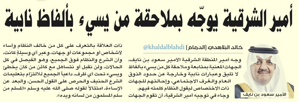 يذكر أن «عكاظ» نشرت في عددها الصادر أمس (الخميس) خبرا بعنوان (أمير الشرقية يوجه بملاحقة من يسيء بألفاظ نابية).