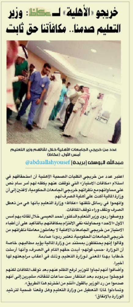 وكان عدد من خريجي الكليات الصحية الأهلية أكدوا لـ«عكاظ» أن استحقاقهم في تسلم «مكافآت الامتياز» التي توقفت عنهم يكفله لهم أمر سام نص على مساواتهم مع نظرائهم خريجي الجامعات الحكومية، لافتين إلى أن وزارة المالية أكدت أهلية الصرف لهم.
