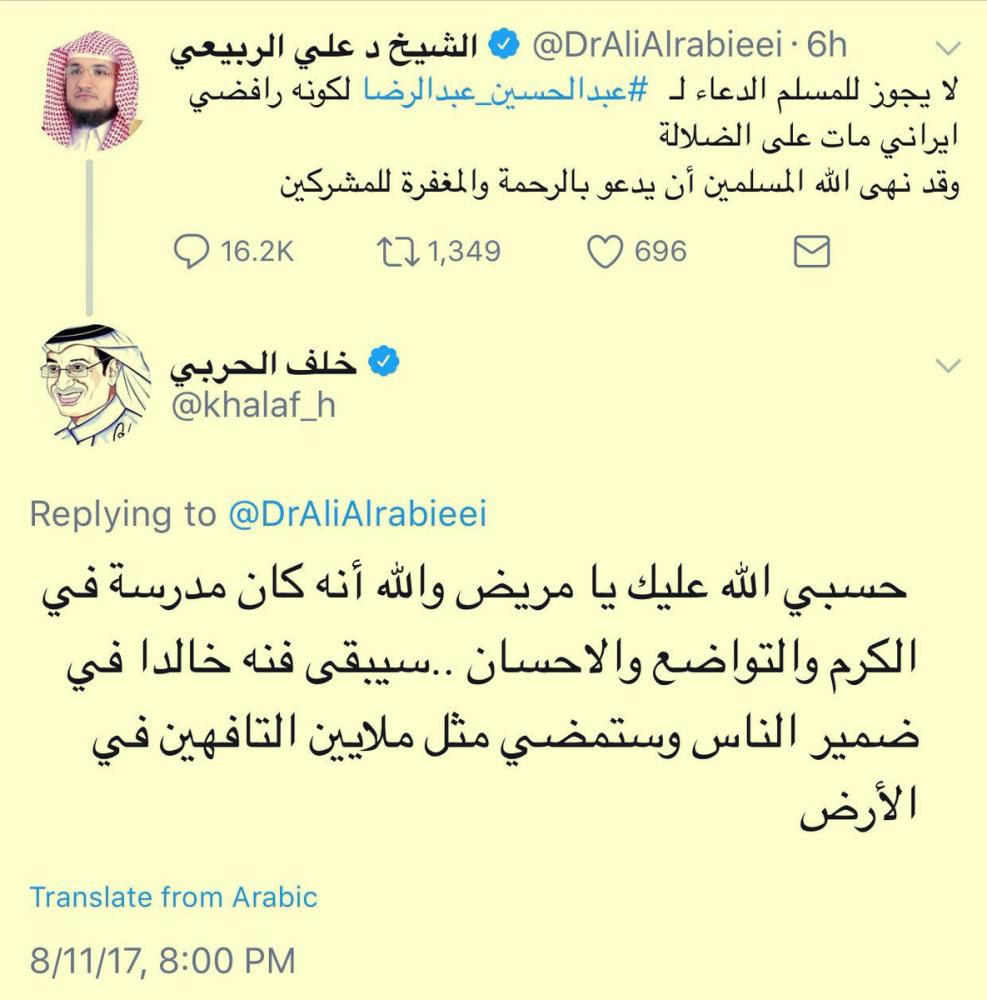 وأضافوا: «هناك من تطوّع من السعوديين للترافع ضد تلك التغريدات المسيئة بحق الراحل عبدالحسين عبدالرضا وبحق الطائفة الشيعية التي هي جزء أصيل من المكوّن الوطني السعودي منذ تأسيس المملكة على يد المغفور له الملك عبدالعزيز طيّب الله ثراه، ومنهم من تطوع لإبلاغ الجهات المختصة عن تلك الإساءات، ومن المؤكد أنه سينال عقابه في ظل عهد الحزم والعزم».