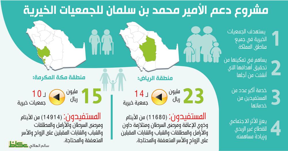 يذكر أن مشروع دعم الأمير محمد بن سلمان بن عبدالعزيز للجمعيات الخيرية يشمل جميع مناطق المملكة، وفئات الجمعيات كافة، وشرائح متنوعة من المستفيدين، وانطلق الأسبوع الماضي من منطقة الرياض بمبلغ 23 مليون ريال، وأوفى بمتطلبات 11680 مستفيداً ومستفيدة من خلال 14 جمعية خيرية، شملت 7 فئات من رعاية الأيتام وذوي الإعاقة ومرضى السرطان ومتلازمة داون والأرامل والمطلقات والشباب والشابات المقبلين على الزواج والأسر المتعففة والمحتاجة.