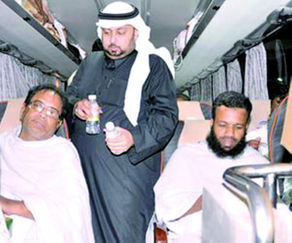 عبوات زمزم صغيرة أثناء توزيعها على الحجاج في الحافلات. (عكاظ)