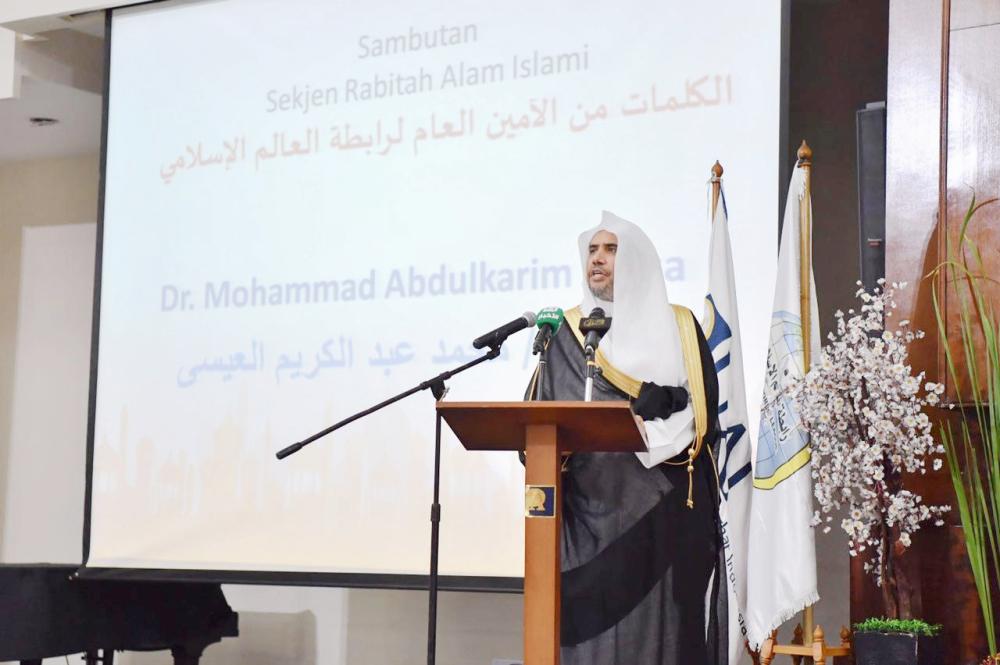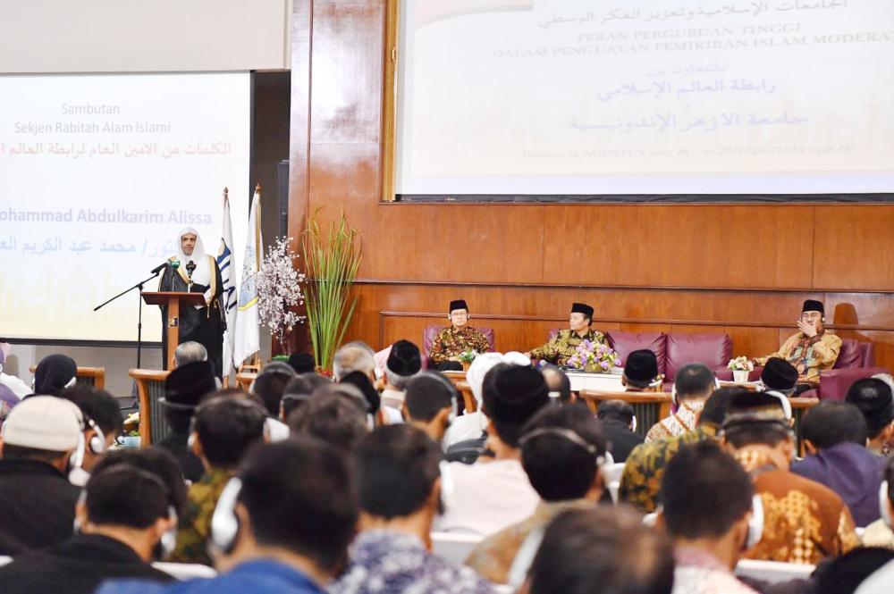 ولفت العيسى إلى أن التطرف تمدد في مناطق الصراع والتمكين الطائفي وضعف الوعي، جاء ذلك في كلمة ألقاها الشيخ العيسى خلال المؤتمر الدولي للجامعات الإسلامية وتعزيز الفكر الوسطي الذي نظمته رابطة العالم الإسلامي بالتعاون مع الجامعة الأزهرية الإندونيسية في جاكرتا، بحضور وزير الشؤون الدينية في إندونيسيا لقمان حكيم سيف الدين، ونائب رئيس مجلس الشورى الشعبي الإندونيسي محمد هداية نور واحد، والدكتور أحمد حسين لوبس رئيس الجامعة الأزهرية، والدكتور جملي الصديقي رئيس المؤسسة الأزهرية التعليمية والرئيس العام لرابطة المثقفين الإندونيسيين مؤسس المحكمة الدستورية، وأنيس باسويدان حاكم جاكرتا وزير التعليم السابق، ومحمد دين شمس الدين رئيس الجمعية المحمدية، إضافة إلى حضور عدد من العلماء، والباحثين، وأساتذة الجامعات من داخل إندونيسيا وخارجها.