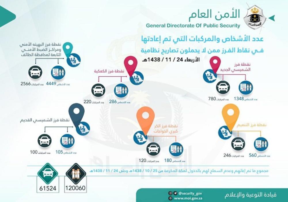 وأوضح حساب "الأمن العام"، أن "مجموع من تمت إعادتهم وعدم السماح لهم بدخول مكة المكرمة من 25-10-1438 وحتى 24-11-1438 بلغ 120060 شخصًا و61524 سيارة".