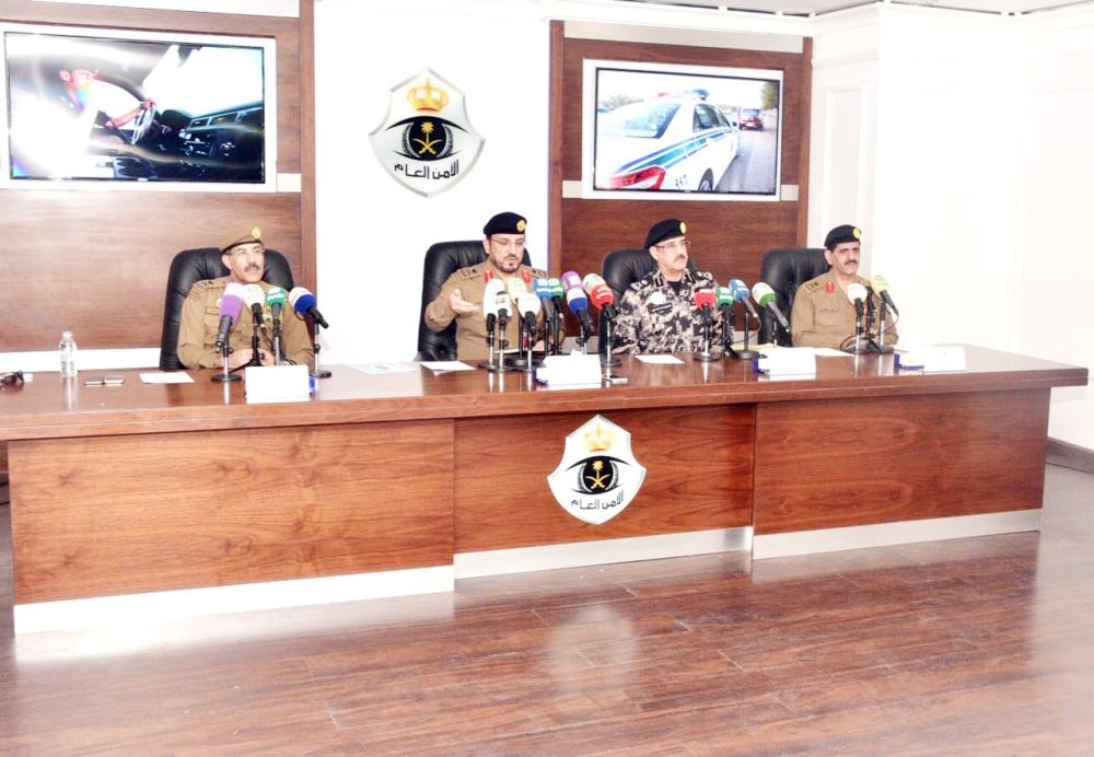القيادات الأمنية خلال المؤتمر الصحفي. (عكاظ)