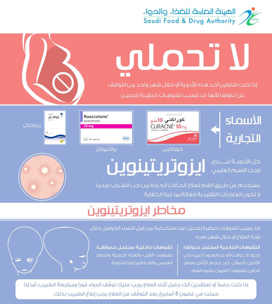 حذرت الهيئة العامة للغذاء والدواء النساء الحوامل من استخدام مستحضر «ايزوتريتينوين» الذي يستخدم كدواء لعلاج حالات حادة من حب الشباب، لافتة إلى أنه يؤدي لحدوث تشوهات خلقية خطيرة للجنين.