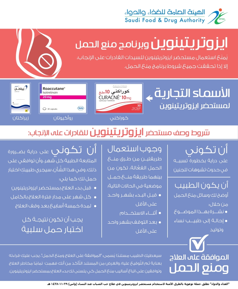 وشدد على ضرورة ألا يتم تناول مستحضر ايزوتريتينوين في حال كانت المرأة حاملا، أو إذا أصبحت حاملا وتعذر عليها تجنب الحمل، أو إذا كانت تنوي الحمل، أو إذا كانت قادرة على الإنجاب ولا تستخدم وسائل منع الحمل اللازمة مع هذا الدواء لتفادي الضرر الذي قد يلحق بالجنين.