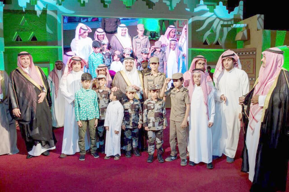 الأمير فيصل بن مشعل مع أبناء شهداء الواجب في الاحتفالية. (عكاظ)