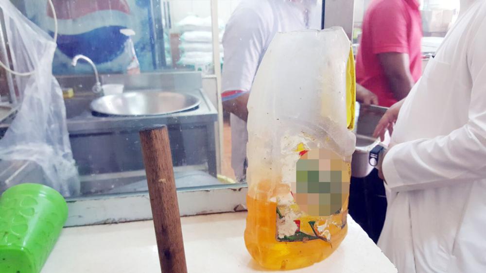عبوة زيت قديمة ومكشوفة في المطعم المغلق. (عكاظ)