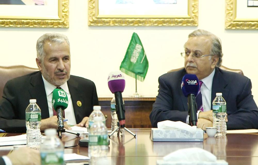 عبدالله الربيعة متحدثاً في مؤتمره الصحفي في نيويورك أمس. (واس)