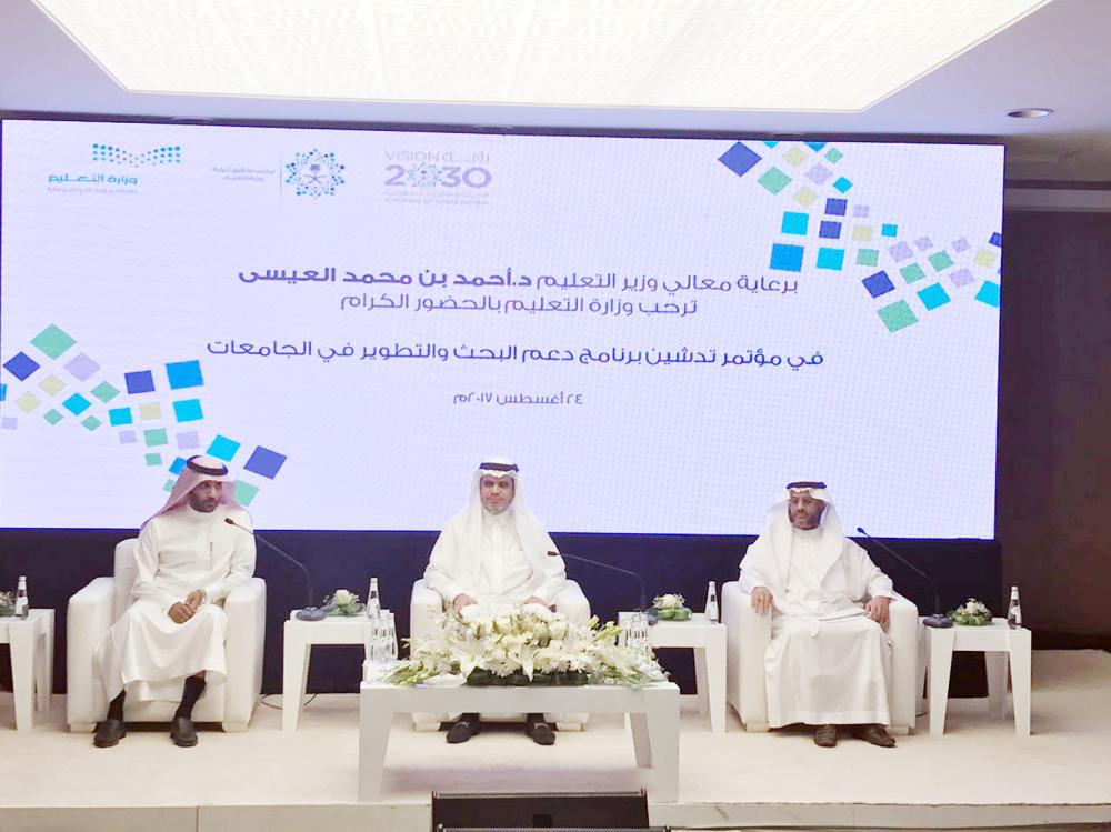 وبين أن إطلاق مبادرة دعم وتطوير البحث العلمي ضمن مبادرات التحول الوطني، تحقيقا لرؤية المملكة 2030، ونتطلع إلى أن تسهم هذه المبادرة في عجلة البحث والتطوير بجامعاتنا، مبينا أنه رصد لها نحو 6 مليارات ريال إلى 2020، وهي مبادرة أساسية ودعم سخي في هذه المرحلة، متمنياً أن تستثمر بالشكل المناسب الذي يخدم الجامعات، وتستطيع أن توجد تحالفات علمية وبحثية مع مؤسسات وجامعات وشركات دولية تمتلك الخبرة والأدوات اللازمة للنجاح لتطبيق منتجاتها. ولفت إلى أن المبادرة تركز على تحويل البحث العلمي إلى منتجات اقتصادية، مضيفاً: «نحتاج إلى عقولكم وجهدكم ومبادراتكم، واستنفار الطاقات العلمية والبحثية داخل الجامعات وإيجاد البيئة التي تستطيعون من خلالها ترتيب كل ما يتعلق بمنظومة البحث العلمي».