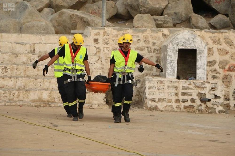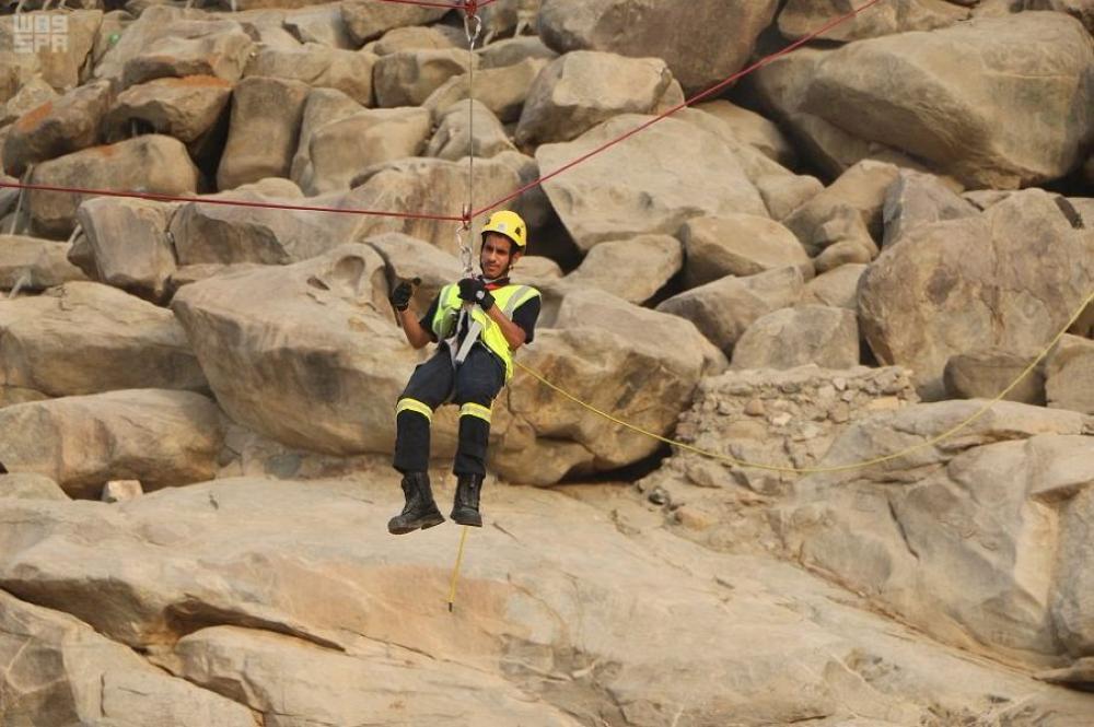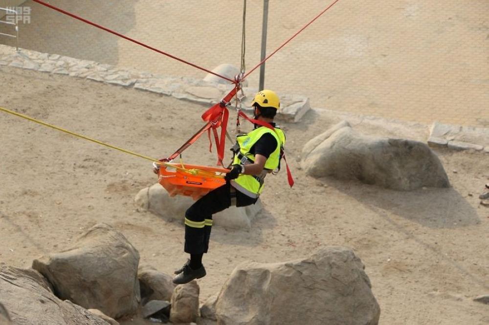 ونفذت قوات الدفاع المدني تدريبات الإنقاذ الجبلي في جبل الرحمة بعرفات حيث أجريت تجربة إنقاذ أحد المصابين وذلك بواسطة سرير معلق على حبال من أعلى جبل الرحمة وحتى أسفل الجبل توفر الكثير من الجهد والوقت بحسب قائد فريق الإنقاذ الجبلي الرائد سعد البقمي.