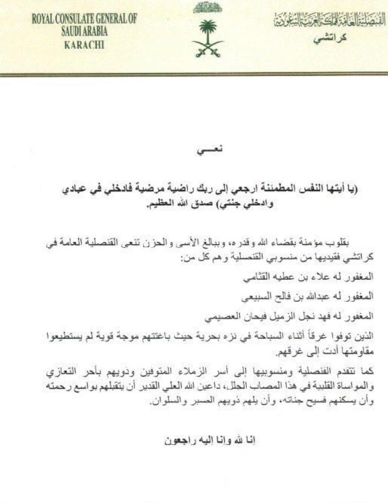 نعت القنصلية العامة في كراتشي عبر حسابها في "تويتر" فقيديها من منسوبي القنصلية وهم كل من علاء بن عطية القثامي، عبدالله بن فالح السبيعي، وفهد نجل موظف القنصلية فيحان العصيمي الذين توفوا غرقا أثناء السباحة في نزهة بحرية، حيث باغتتهم موجة قوية لم يستطيعوا مقاومتها أدت إلى غرقهم.