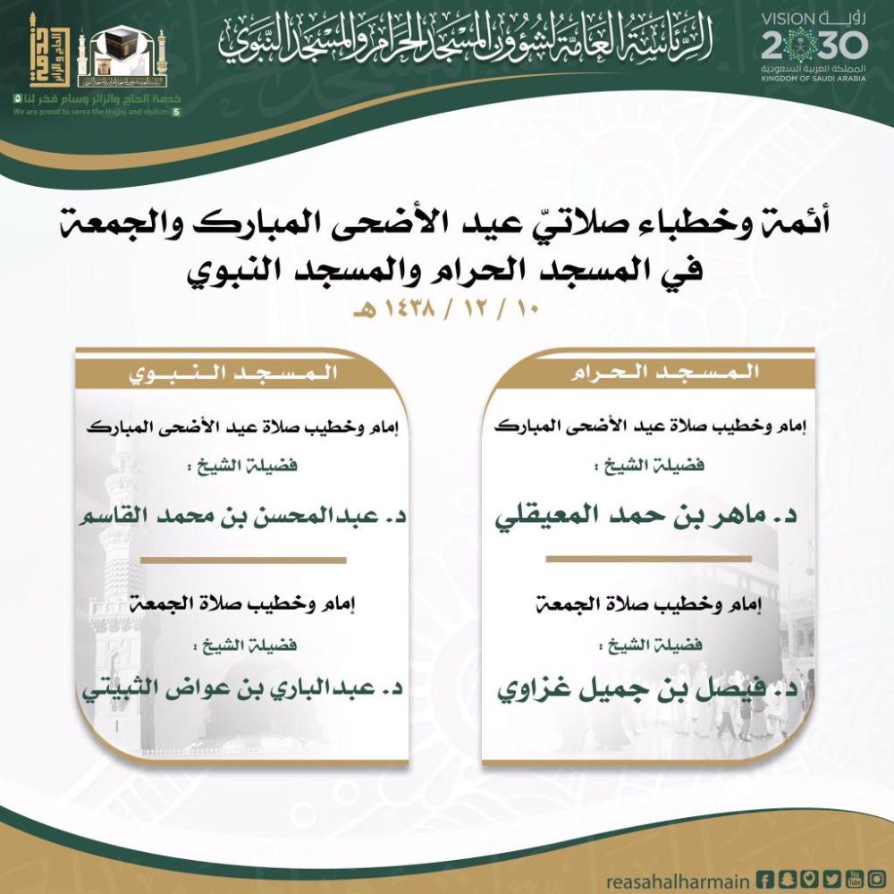 أعلنت الرئاسة العامة لشؤون المسجد الحرام والمسجد النبوي عبر حسابها الرسمي في موقع التواصل الاجتماعي “تويتر”، عن أئمة وخطباء صلاتيّ عيد الأضحى المبارك والجمعة في المسجد الحرام والمسجد النبوي.