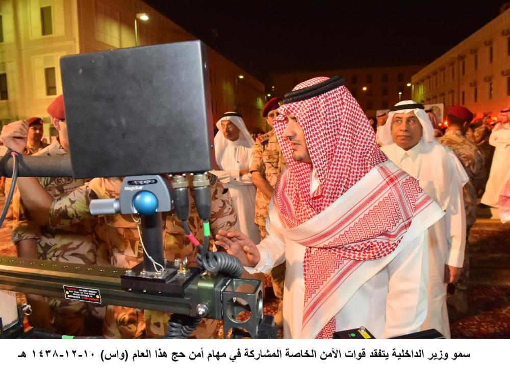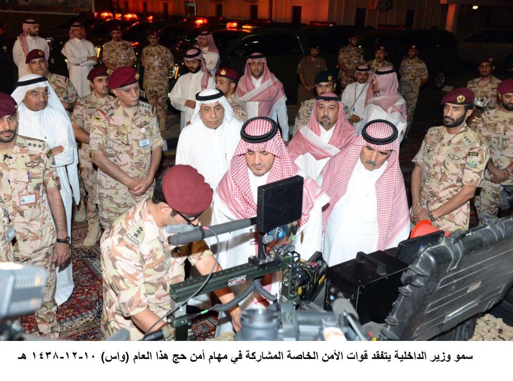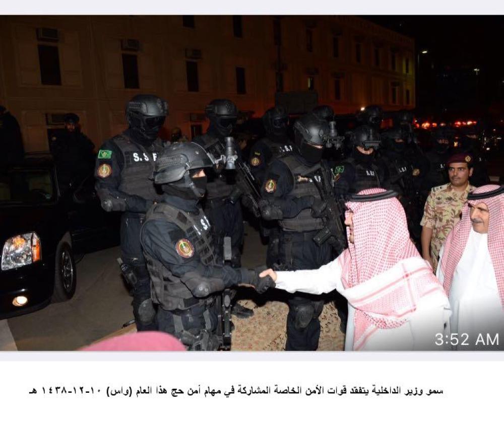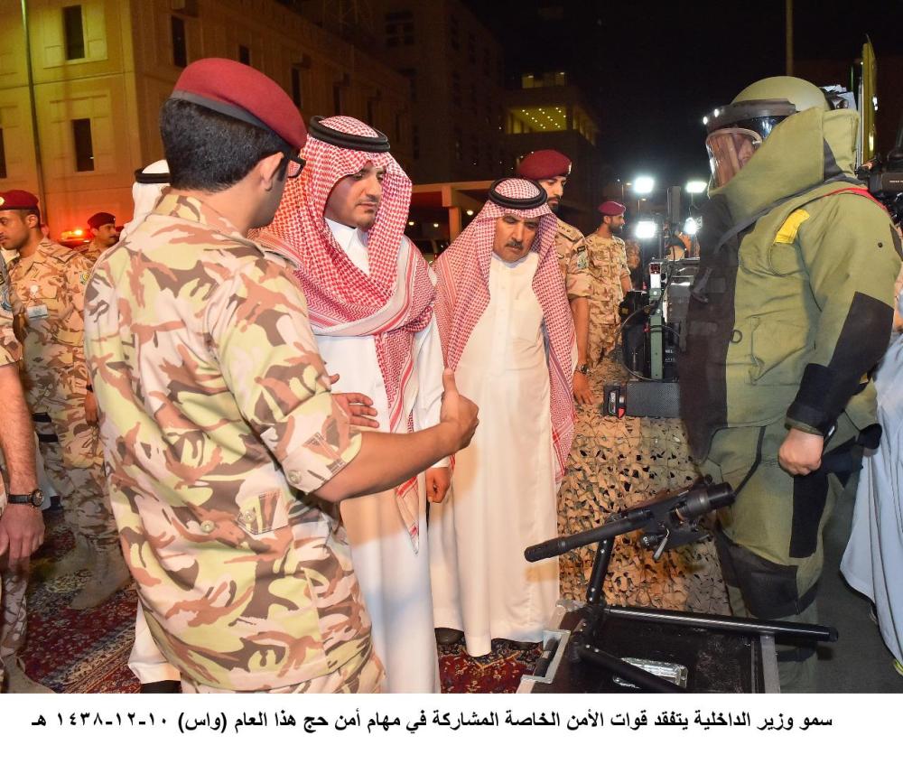 تفقد صاحب السمو الملكي الأمير عبدالعزيز بن سعود بن نايف بن عبد العزيز، وزير الداخلية رئيس لجنة الحج العليا، مساء أمس، قوات الأمن الخاصة المشاركة في مهام أمن حج هذا العام 1438هـ، حيث وقف سموه على استعداداتهم وجاهزيتهم لتنفيذ مهامهم للمشاركة في المحافظة على أمن حجاج بيت الله الحرام ومساندة زملائهم بقوات أمن الحج لتنفيذ توجيهات خادم الحرمين الشريفين الملك سلمان بن عبدالعزيز آل سعود، وصاحب السمو الملكي الأمير محمد بن سلمان بن عبدالعزيز آل سعود ولي العهد نائب رئيس مجلس الوزراء وزير الدفاع - حفظهما الله - لخدمة حجاج بيت الله الحرام ليؤدوا مناسكهم بكل يسر وسهولة وأمان.