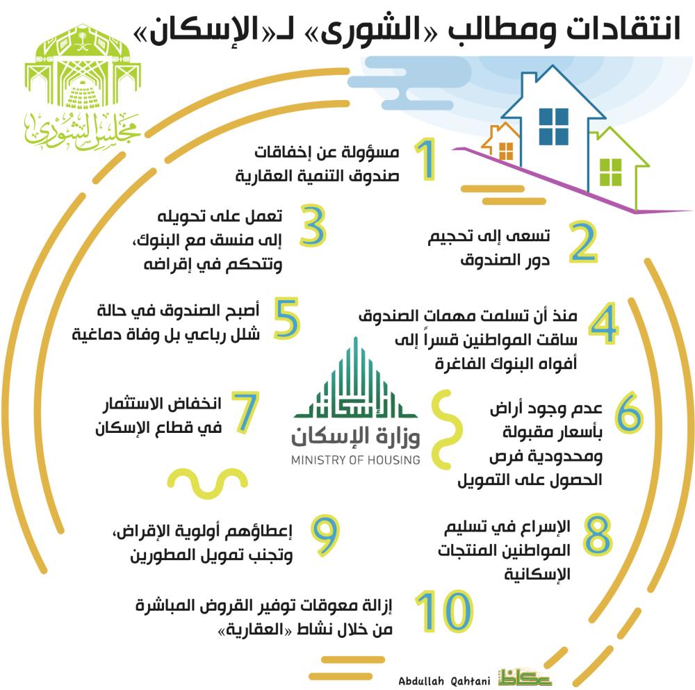 يتوقع أن تواجه وزارة الإسكان ووزيرها ماجد الحقيل أثناء مناقشة تقرير صندوق التنمية العقارية الإثنين القادم انتقادات حادة، عطفا على تحميل أعضاء في جلسات سابقة الوزارة مسؤولية إخفاقات الصندوق، خصوصاً عضو المجلس الدكتور سعدون السعدون الذي أشار إلى أن الوزارة تسعى إلى تحجيم دور الصندوق وتحويله إلى منسق مع البنوك ليقع المواطن ضحيتها، وتتحكم في إقراضه، لافتاً إلى أن الصندوق ساهم طوال السنوات الماضية في إسعاد المواطنين عبر امتلاك منازل تلبي حاجاتهم. من جانبها، أكدت عضو مجلس الشورى فاطمة القرني أن الوزارة ومنذ أن تسلمت زمام أمور الصندوق الذي يرأس وزير الإسكان مجلس إدارته ساقت المواطنين قسراً إلى أفواه البنوك الفاغرة حتى أقصى اتساعها، لافتة إلى أن الصندوق في حالة شلل رباعي بل وفاة دماغية. ويعيد صندوق التنمية العقارية الإثنين القادم وزارة الإسكان إلى دائرة النقد تحت قبة مجلس الشورى، من خلال مناقشة تقرير لجنة الحج والإسكان والخدمات التقرير السنوي للصندوق، الذي سبق أن دافع عن الانتقادات التي تعرض لها من أعضاء شورى، وطالب بتنويع المنتجات والبرامج التمويلية بالتعاون مع الجهات الحكومية، وذهب إلى أن المشكلة تكمن في عدم وجود أراض بأسعار مقبولة، ومحدودية الفرص في الحصول على التمويل، وانخفاض الاستثمار في قطاع الإسكان، وعدم الاستفادة من مخزون الإسكان القديم. وكان مجلس الشورى طالب الوزارة بالإسراع في تسليم المواطنين المنتجات الإسكانية، مع التأكيد على إزالة المعوقات لخيار توفير القروض المباشرة من خلال نشاط صندوق التنمية العقارية، وإعطاء المواطنين أولوية الإقراض، وأن تتجنب تمويل المطورين.
