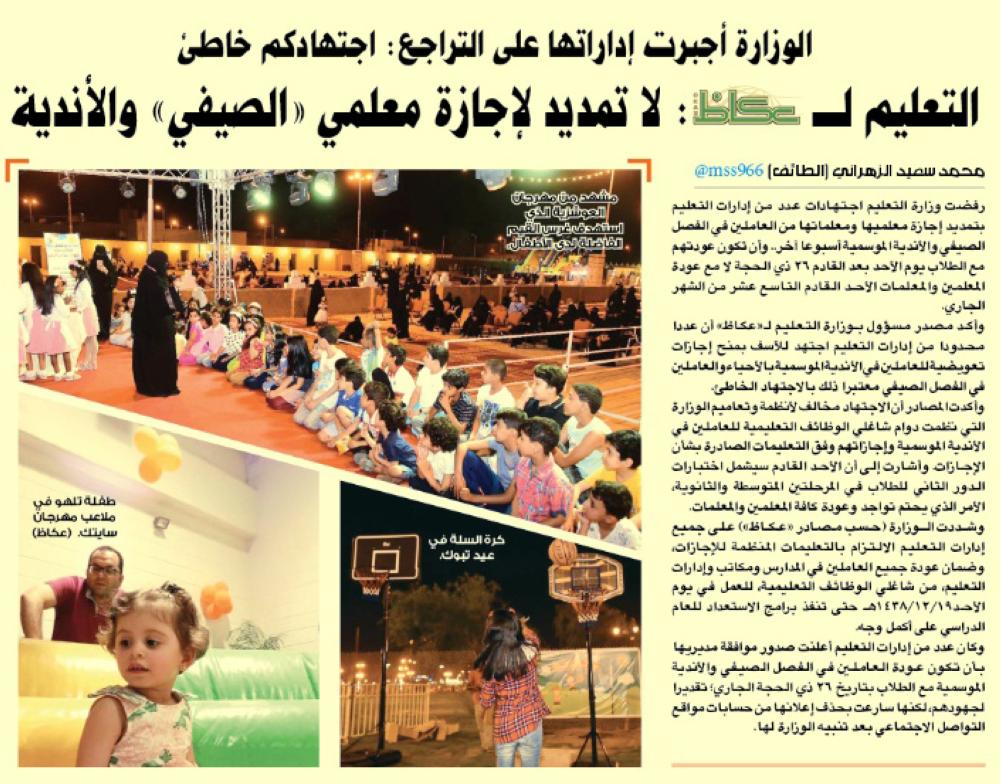 صادق متحدث وزارة التعليم مبارك العصيمي على انفراد «عكاظ» الأربعاء الماضي تحت عنوان «التعليم تقطع طريق الاجتهادات: لا تمديد لإجازة معلمي الصيفي»، معلنا أن الدوام اليوم (الأحد) للجميع دون استثناء (معلمين ومعلمات).